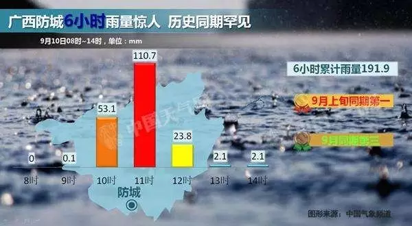 △ 9月10日8时至14时,广西防城降下历史同期罕见的110.7毫米大暴雨。
