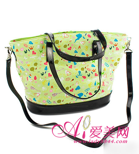 以浅绿色作为基色调,清新宜人。包包面上缀满可爱的彩色印花图案,彰显俏皮可爱感。黑色链带和黑色底的拼接打破单调感,同时增加一点稳重气息。水桶包的造型容量可是不容忽视的哦!